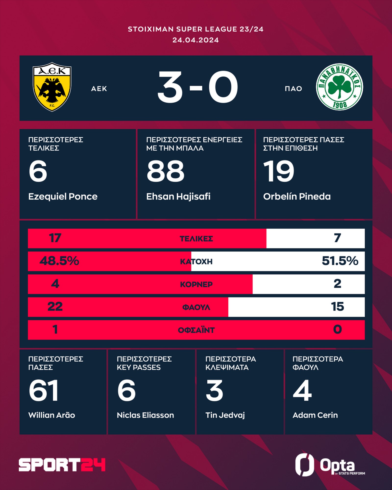 Το αθηναϊκό ντέρμπι της OPAP Arena βάφτηκε κιτρινόμαυρο, καθώς η ΑΕΚ επικράτησε 3-0 του Παναθηναϊκού. Η ομάδα του Ματίας Αλμέιδα πήραν ένα πολύ σημαντικό τρίποντο και έγιναν το απόλυτο φαβορί για τον τίτλο.