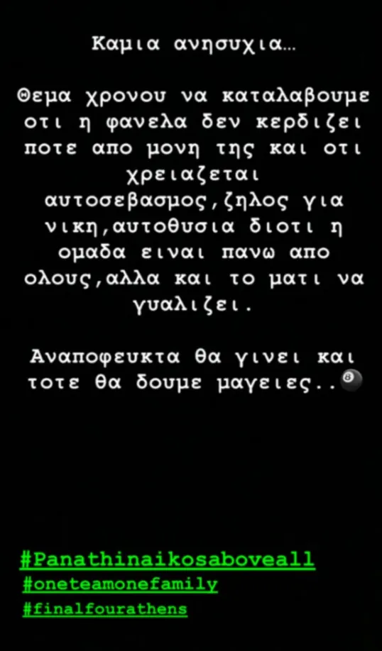 “Καμία ανησυχία… Θέμα χρόνου να καταλάβουμε ότι η φανέλα δεν κερδίζει ποτέ από μόνη της και ότι χρειάζεται αυτοσεβασμός, ζήλος για νίκη, αυτοθυσία διότι η ομάδα είναι πάνω απ’ όλους, αλλά και το μάτι να γυαλίζει.