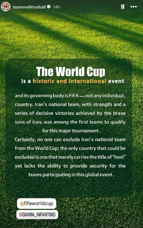 «Αναμφίβολα, κανείς δεν μπορεί να αποκλείσει την εθνική ομάδα του Ιράν από το Παγκόσμιο Κύπελλο. Η μόνη χώρα που θα μπορούσε να αποκλειστεί είναι εκείνη που φέρει απλώς τον τίτλο του “διοργανωτή”, αλλά αδυνατεί να εγγυηθεί την ασφάλεια των ομάδων που συμμετέχουν σε αυτό το παγκόσμιο γεγονός», ανέφερε η ομάδα του Ιράν σε ανάρτησή της στα social media.