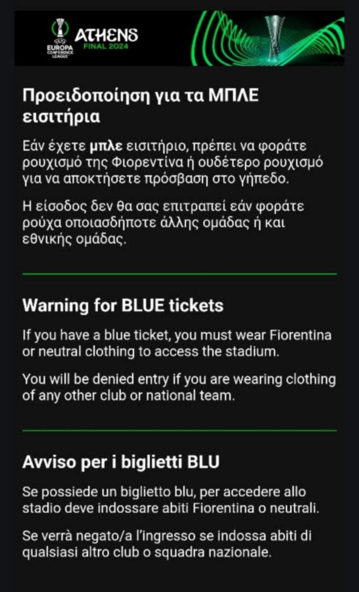 “Εάν έχετε μπλε εισιτήριο, πρέπει να φοράτε ρουχισμό της Φιορεντίνα ή ουδέτερο ρουχισμό για να αποκτήσετε πρόσβαση στο γήπεδο. Η είσοδος δεν θα σας επιτραπεί εάν φοράτε ρούχα οποιασδήποτε άλλης ομάδας ή και εθνικής ομάδας”.