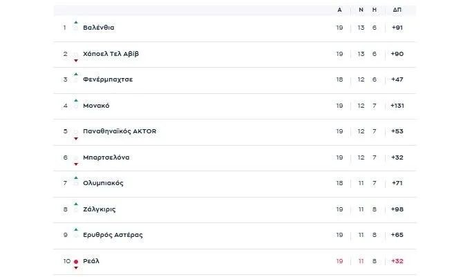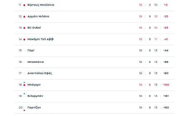 Οι ερυθρόλευκοι έχουν, βέβαια, ένα ματς λιγότερο, εκείνο με την Φενέρμπαχτσε στο ΣΕΦ που είχε αναβληθεί και οδεύει για τον Μάρτιο.