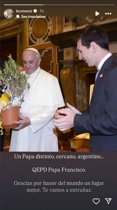 “Ένας διακεκριμένος, προσιτός, Αργεντινός Πάπας… Αναπαύσου εν ειρήνη, Πάπα Φραγκίσκε. Σε ευχαριστούμε που έκανες τον κόσμο καλύτερο. Θα μας λείψεις”, ήταν το μήνυμα του Αργεντινού σούπερ-σταρ όπως αναφέρει το Sport24.gr.