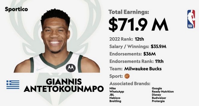 Ο Greek Freak είναι στην 12η θέση της λίστας των πιο καλοπληρωμένων αθλητών του τελευταίου έτους, με το Sportico να εξηγεί πως κέρδισε 35.9 εκατομμύρια από το συμβόλαιό του με τους Μιλγουόκι Μπακς και 36 εκατομμύρια από εμπορικές συμφωνίες με εταιρείες όπως η Nike, η Whatsapp, η JBL, η Breitling, η Google, η Ready, η Disney, η Budweiser, η Nabisco και η Protergia.