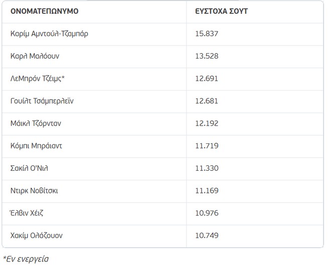 Ιδού η λίστα με τους πρώτους 10 παίκτες σε εύστοχα σουτ στην ιστορία του ΝΒΑ, με τον ΛεΜπρόν Τζέιμς να είναι ο μοναδικός εν ενεργεία παίκτης: