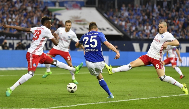 Hamburg's Bakery Jatta and Hamburg's Kyriakos Papadopoulos, right, challenge for the ball with Schalke's Klaas Jan Huntelaar, center, during the German Bundesliga soccer match between FC Schalke 04 and Hamburger SV in Gelsenkirchen, Germany, Saturday, May 13, 2017. (AP Photo/Martin Meissner) AP