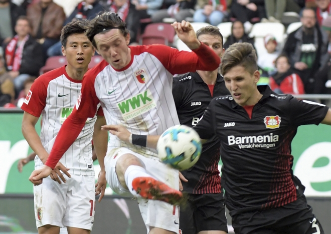 Augsburg's Michael Gregoritsch, left, and Leverkusen's Panagiotis Retsos vie for the ball during the German Bundesliga soccer match between FC Augsburg and Bayer Leverkusen in Augsburg, Germany, Saturday, Nov. 4, 2017. (Stefan Puchner/dpa via AP) AP