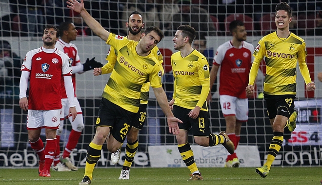 Dortmund's Sokratis, left, celebrates his side's opening goal during a German first division Bundesliga soccer match between FSV Mainz 05 and Borussia Dortmund in Mainz, Germany, Tuesday, Dec. 12, 2017.(AP Photo/Michael Probst) AP