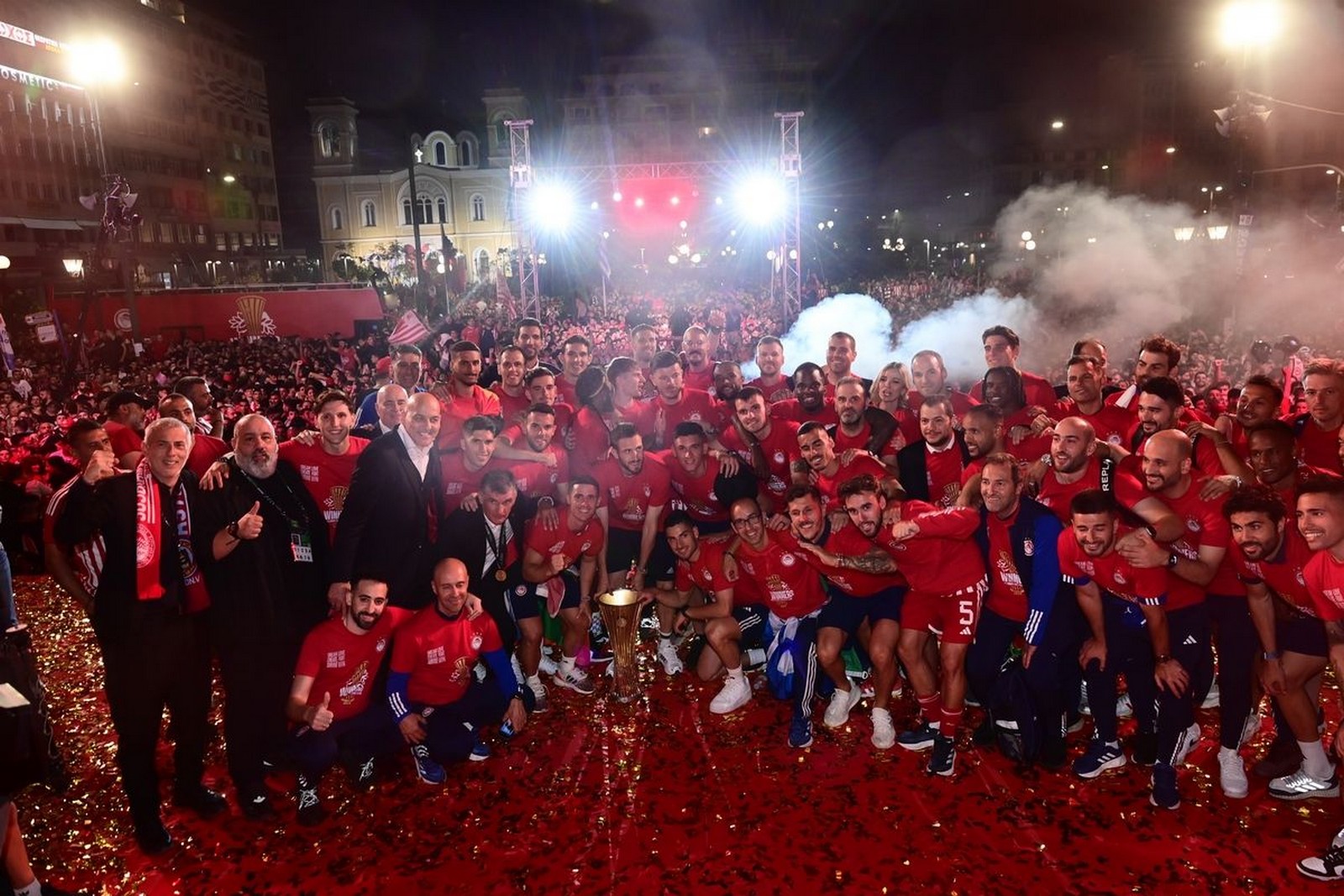Οι παίκτες του Ολυμπιακού σήκωσαν το τρόπαιο στον πειραϊκό ουρανό, αποθεώθηκαν από τον κόσμο και έβαλαν τον επίλογο σε μία χρονιά που θα μνημονεύεται για χρόνια.