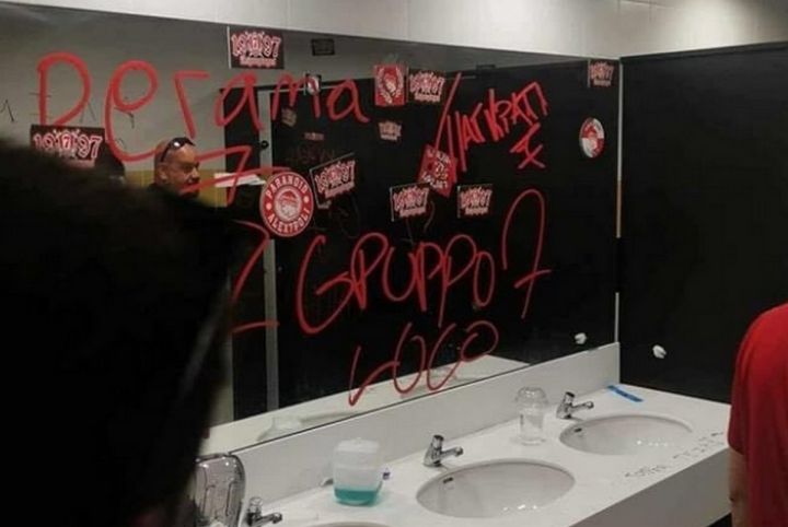 Όπως φαίνεται και από τις φωτογραφίες που δημοσίευσε το SPORT24, οπαδοί του Ολυμπιακού χρωμάτισαν με γκράφιτι τους καθρέπτες, ενώ καταγράφηκαν βανδαλισμοί και φθορές σε αντικείμενα.