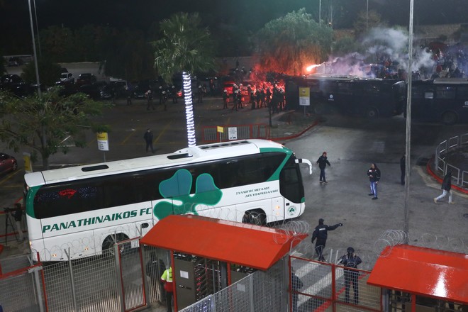 Ένταση μεταξύ αστυνομίας και οπαδών επικράτησε έξω από το στάδιο Γεώργιος Καραϊσκάκης αρκετή ώρα πριν την έναρξη του ντέρμπι κατά την άφιξη των αποστολών των δύο ομάδων.