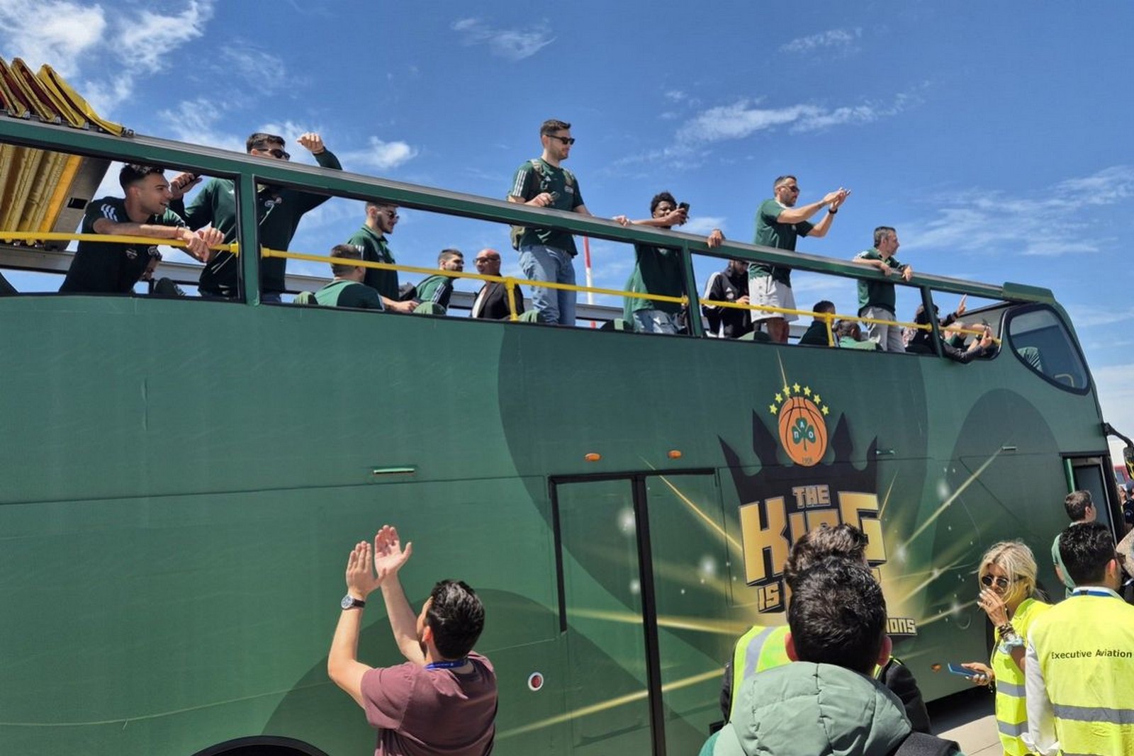 Με την άφιξή τους στο αεροδρόμιο, οι παίκτες πήραν αμέσως θέση στο ανοιχτό λεωφορείο της ομάδας, προκειμένου να μεταβούν στο ΟΑΚΑ.