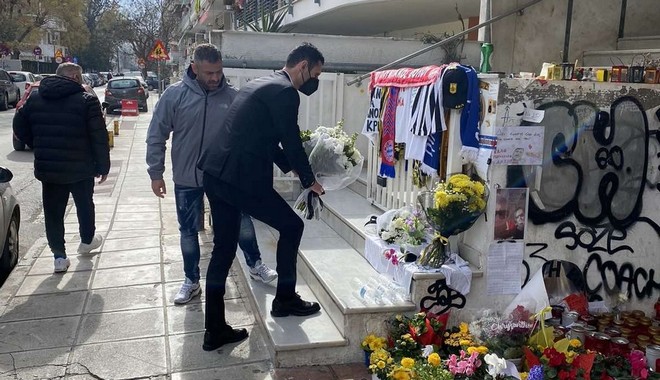 Ο διευθυντής του ποδοσφαιρικού τμήματος του ΠΑΟΚ, Χρήστος Καρυπίδης, καταθέτει λουλούδια στο σημείο της δολοφονίας του Άλκη