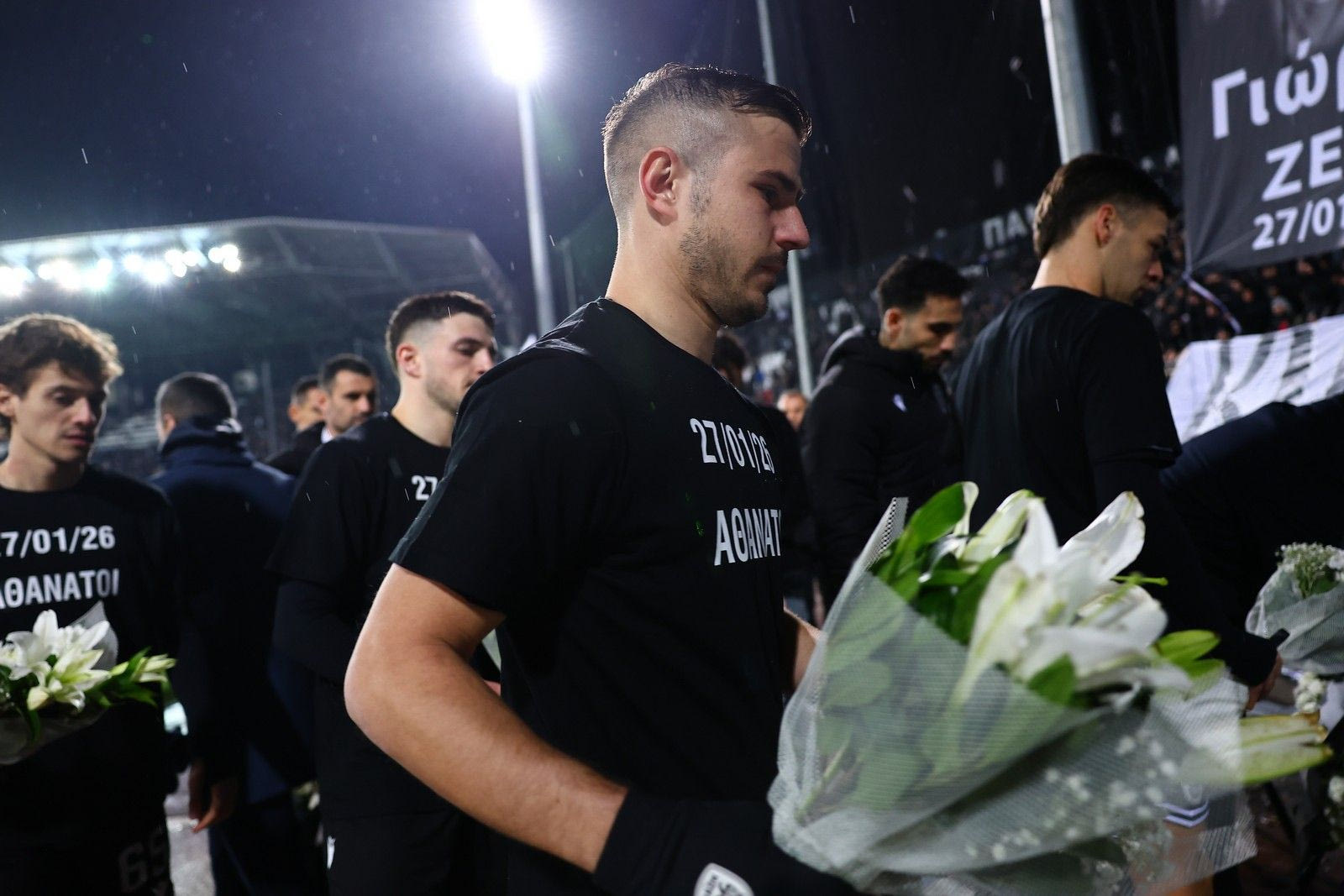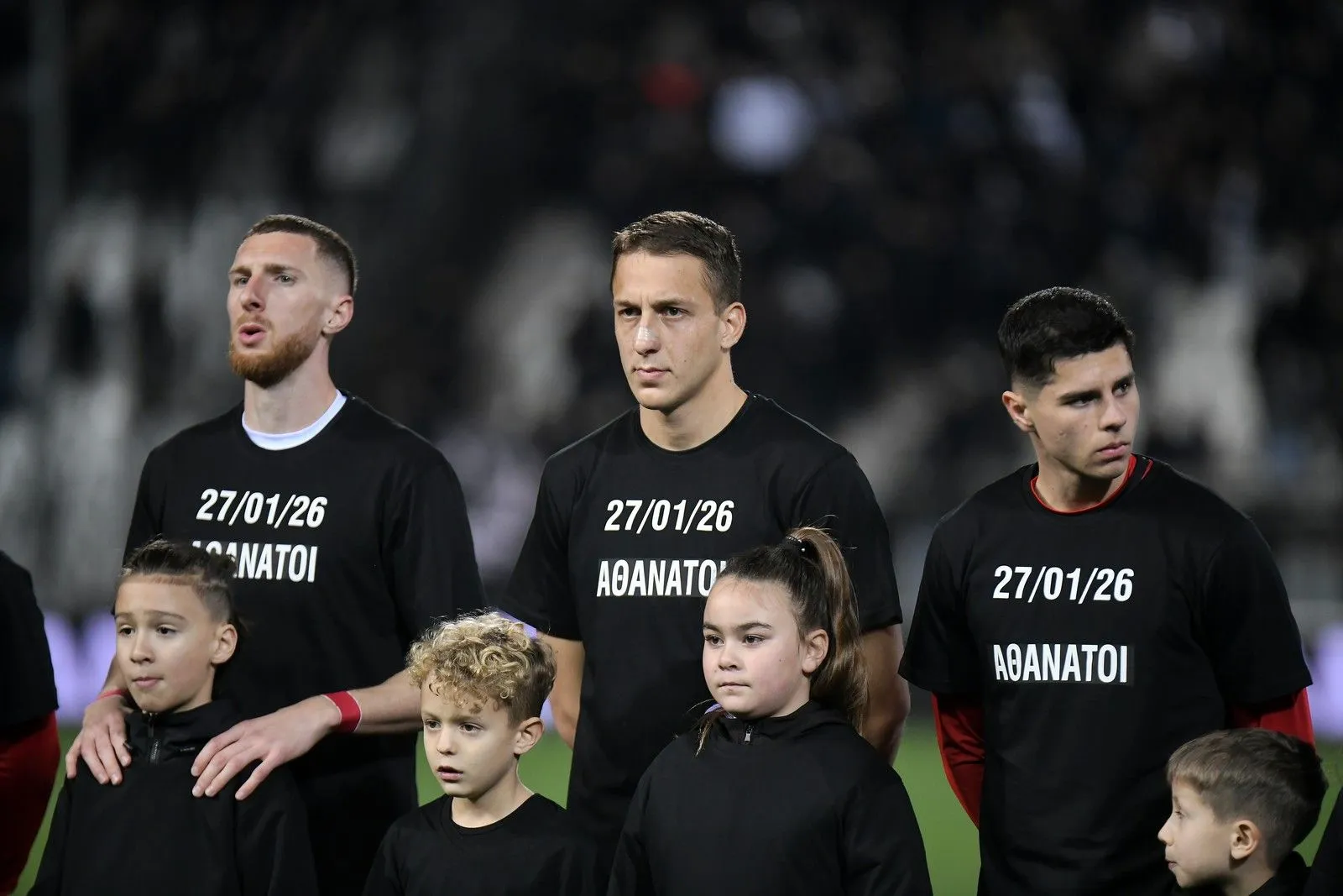 Οι ποδοσφαιριστές φορούσαν μπλουζάκια που έγραφαν “Αθάνατοι, 27/1/2026”, ενώ τηρήθηκε και ενός λεπτού στην μνήμη των επτά νεκρών του δυστυχήματος.