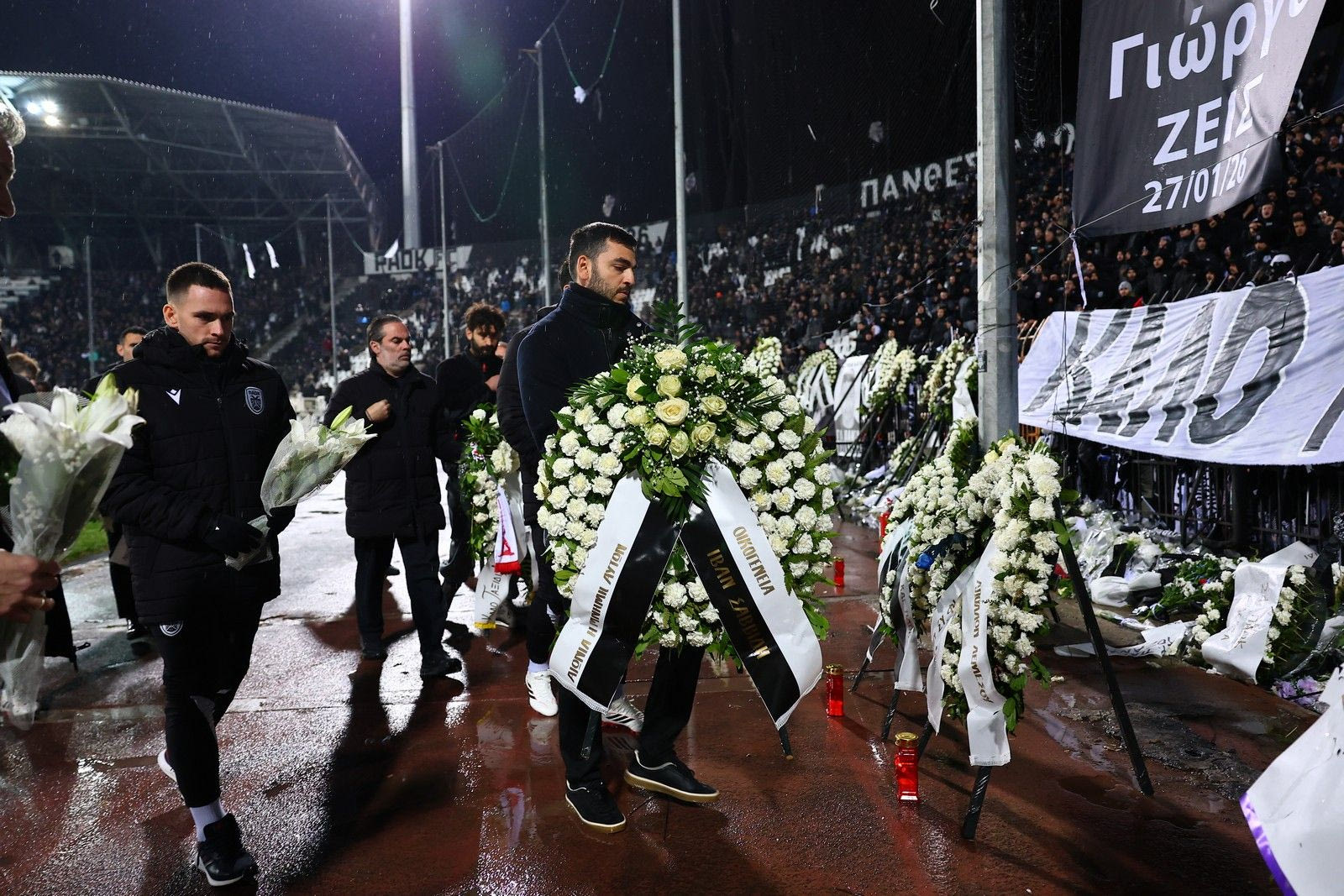 Παράλληλα με δάκρυα στα μάτια και σε μια άκρως συγκινητική ατμόσφαιρα σύνδεσμοι του ΠΑΟΚ, οι δύο ομάδες καθώς και οι διαιτητές του αγώνα μπήκαν στον αγωνιστικό χώρο υπό τους ήχους του τραγουδιού  “Η πόλη της σιωπής” και προχώρησαν στην κατάθεση στεφανιών και λουλουδιών στην Θύρα 4 του γηπέδου πριν ξεκινήσουν το ζέσταμα για την έναρξη του αγώνα.