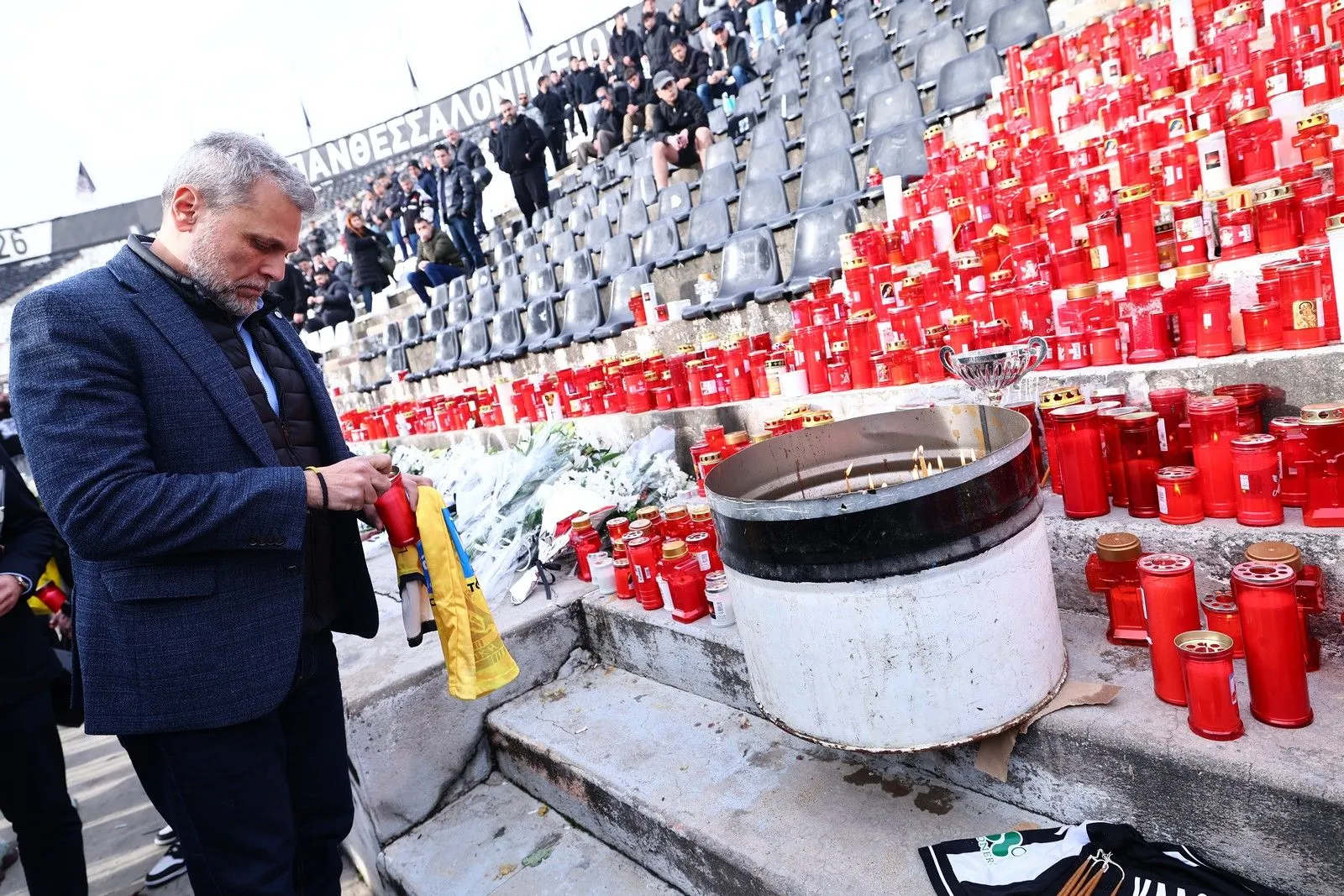 Η οδύνη για τους οκτώ νεκρούς οπαδούς δεν γνωρίζει χρώματα και έτσι αντιπροσωπεία του Άρη επισκέφτηκε την Τούμπα και άφησε λουλούδια, φανέλες και κασκόλ των “κίτρινων” ως φόρο τιμής.