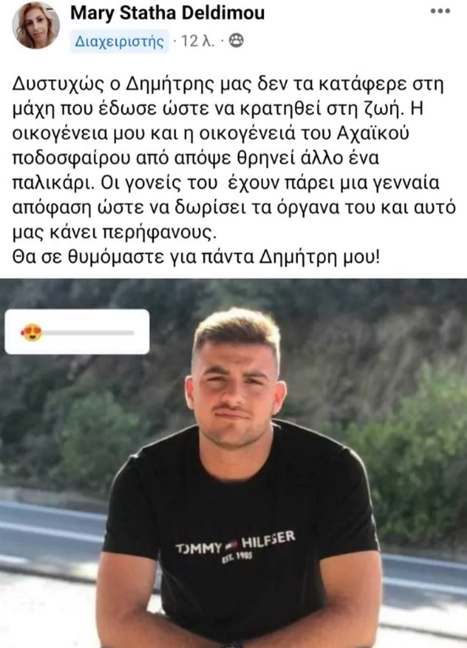 «Δυστυχώς ο Δημήτρης μας δεν τα κατάφερε στη μάχη που έδωσε ώστε να κρατηθεί στη ζωή. Η οικογένεια μου και η οικογένειά του Αχαϊκού ποδοσφαίρου από απόψε θρηνεί άλλο ένα παλικάρι. Οι γονείς του έχουν πάρει μια γενναία απόφαση ώστε να δωρίσει τα όργανα του και αυτό μας κάνει περήφανους. Θα σε θυμόμαστε για πάντα Δημήτρη μου!»”, ανέφερε στην ανάρτησή της.