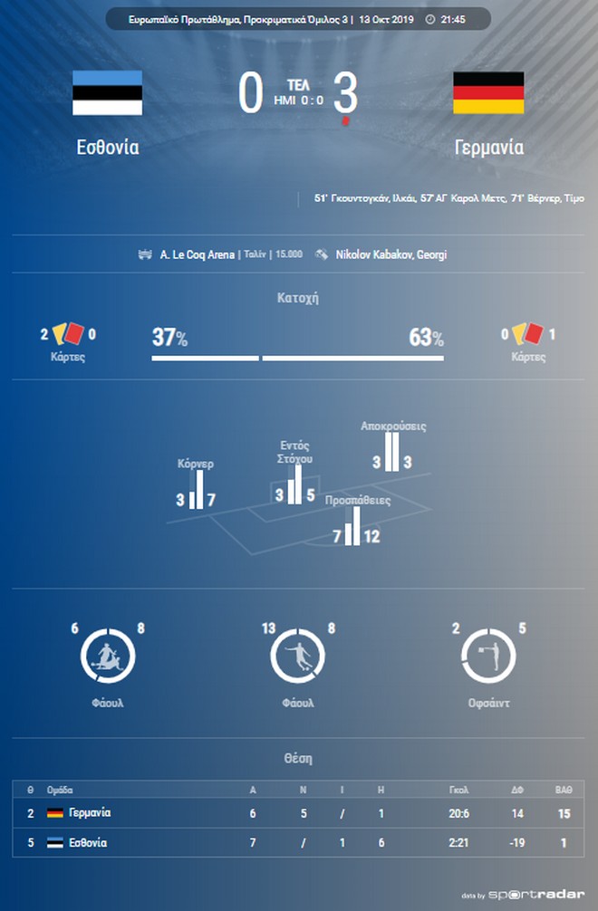 Τα πάντσερ υποχρεώθηκαν να παίξουν με 10 παίκτες από το 14ο λεπτό κόντρα στην Εσθονία, όμως το γεγονός αυτό δεν στάθηκε αρκετό για να τους φρενάρει, απέναντι μάλιστα σε μία αρκετά υποδεέστερη ομάδα την οποία είχαν συντρίψει με 8-0 τον περασμένο Ιούνιο και απέναντι στην οποία μετρούσαν “4 στα 4”.