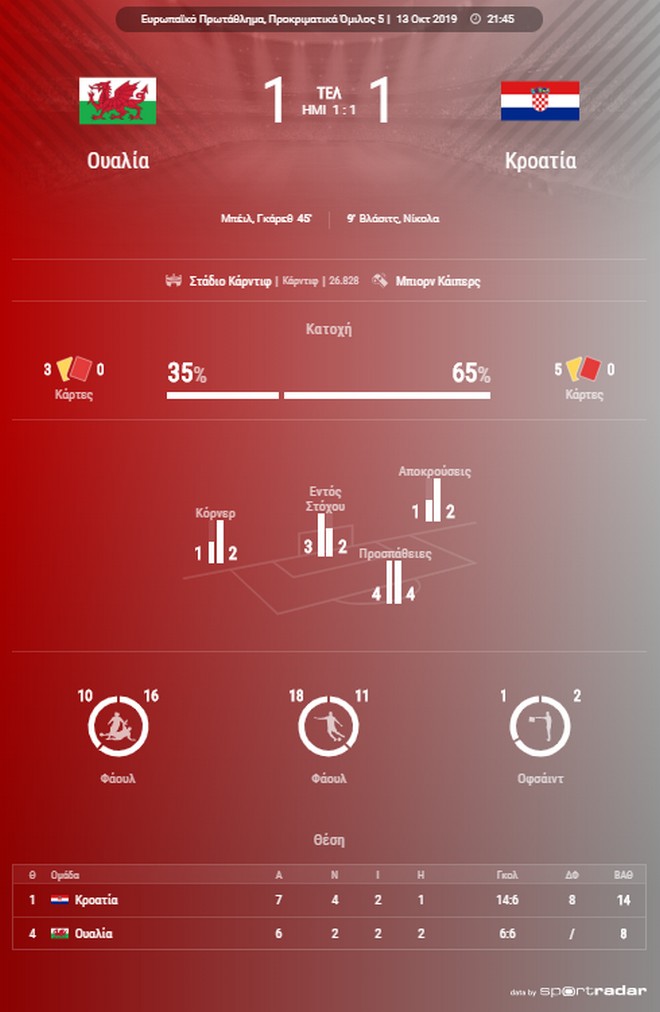 Η Ουαλία μετρούσε μόνο νίκες στα τέσσερα τελευταία εντός έδρας παιχνίδια της, ωστόσο απέναντι στην Κροατία δεν είχε ούτε μία επιτύχια στα πέντε προηγούμενα ραντεβού τους (1 ισοπαλία – 4 ήττες) και αυτή η παράδοση έμελε να συνεχιστεί και το βράδυ της Κυριακής, με τις δύο ομάδες να μένουν στο 1-1 στο μεγάλο ντέρμπι του 5ου προκριματικού ομίλου.