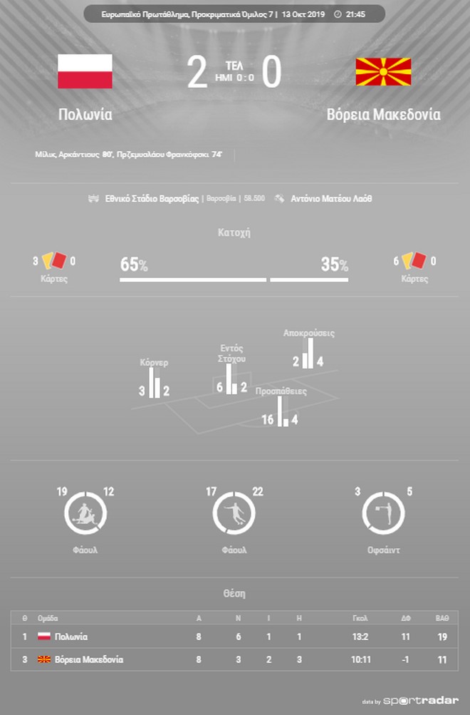 Η Πολωνία ήξερε πως με νίκη κόντρα στην Βόρεια Μακεδονία θα σφράγιζε αυτόματα το εισιτήριο για τα τελικά του Euro 2020 και τα κατάφερε, με τις δύο πρώτες της αλλαγές να αποδεικνύονται χρυσές καθώς ήταν εκείνες που βρήκαν το δρόμο προς τα δίχτυα! Ο Φρανκόβσκι μπήκε στο 74′ αντί του Γκροσίτσκι και στο ίδιο λεπτό έκανε το 1-0 ενώ ο Μίλικ, που είχε αντικαταστήσει τον Σιμάνσκι στο 68′, διαμόρφωσε το τελικό 2-0 στο 80ο λεπτό, στέλνοντας στον έβδομο ουρανό τους Πολωνούς που βρέθηκαν στο “Stadion Narodowy” της Βαρσοβίας. Να σημειωθεί μάλιστα πως αυτή ήταν η τέταρτη σερί φορά που η Πολωνία πανηγύρισε πρόκριση σε τελική φάση Euro και τέταρτη συνολικά στην ιστορία της.
