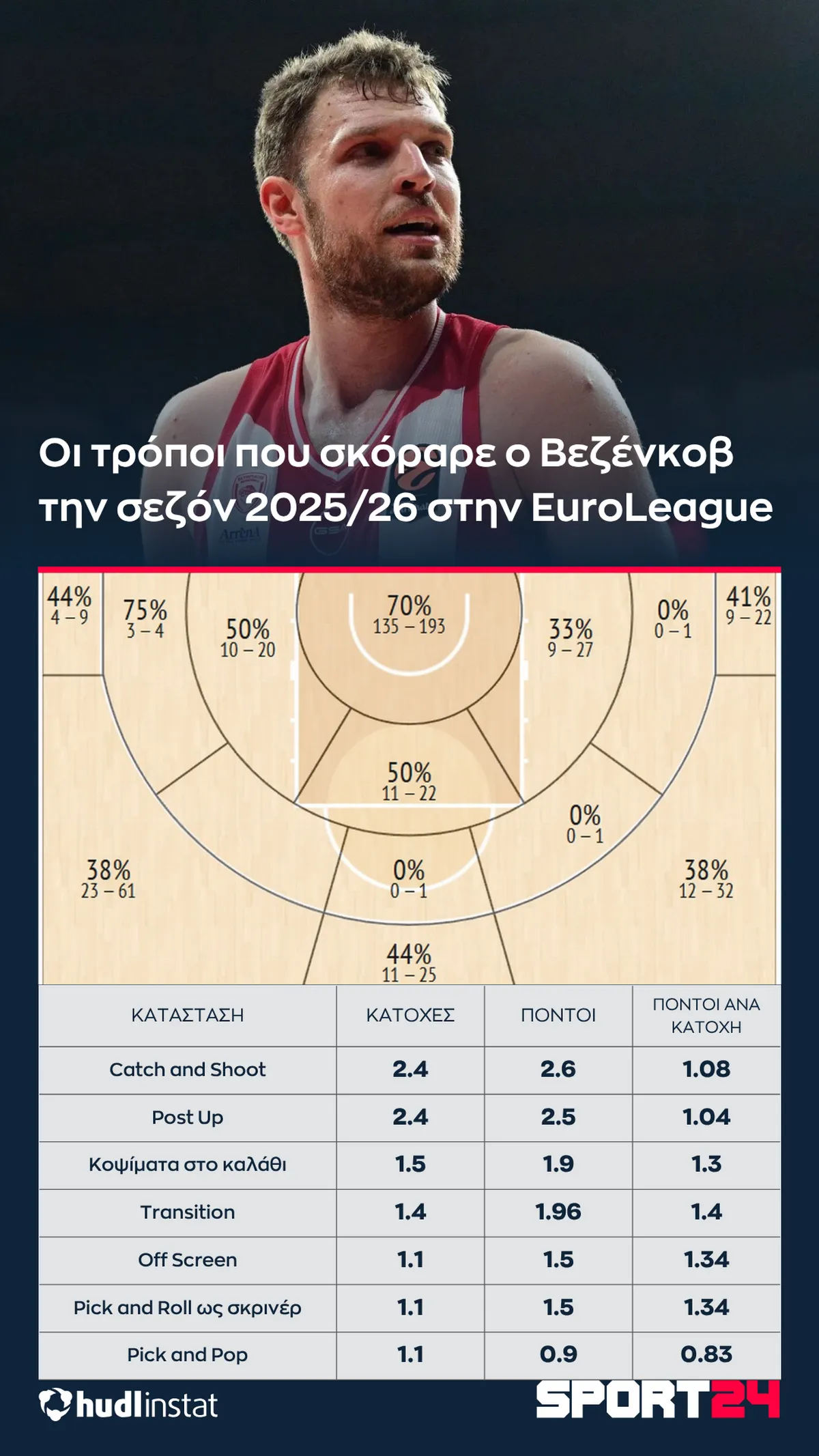 Την φετινή ο Βεζένκοβ ποστάρει – σύμφωνα με το Hudl Instat – σε 2.4 κατοχές ανά αγώνα. Αυτός είναι ο μεγαλύτερος αριθμός της καριέρας του και μάλιστα με σημαντική διαφορά. Συγκεκριμένα, την περσινή σεζόν (2024/25) ο Βεζένκοβ πόσταρε σε 1.8 κατοχές ανά αγώνα, ενώ την σεζόν 2022/23 (τελευταία του στον Ολυμπιακό πριν αποχωρήσει για το NBA δηλαδή, από όπου και επέστρεψε) πόσταρε σε 1.6 κατοχές ανά αγώνα.