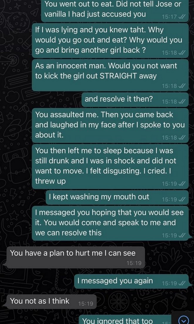 “Δεν θα το αφήσω να με τρώει μέσα μου. Έχω 400 screenshots και συνομιλίες στις οποίες δείχνει ότι είναι ένοχος. Θα τα δημοσιεύσω γιατί δεν με νοιάζει τίποτα. Έχω ενημερώσει τους δικηγόρους μου, δεν με νοιάζουν όμως οι απειλές, ούτε ότι πρέπει να δώσω πίσω τα χρήματα με τα οποία με πλήρωνε.
