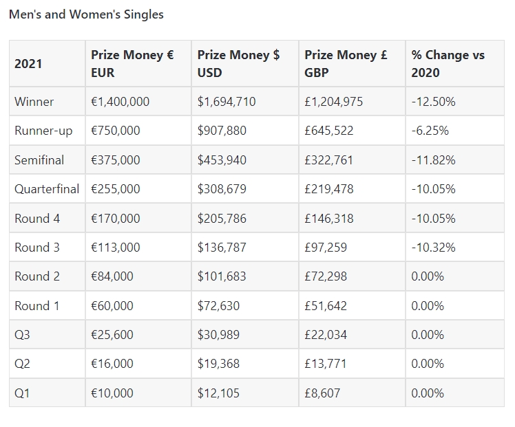 Πάμε όμως να δούμε και τι κέρδη θα δώσει το French Open. Συνολικά, θα μοιράσει €34,367,215, ένα ποσό που είναι μειωμένο κατά -10.53% σε σχέση με το 2020.