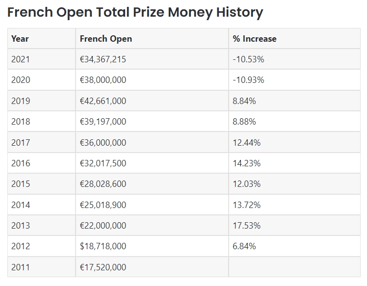 Τα περισσότερα χρήματα που έχει δώσει ποτέ το Roland Garros είναι τα €42,661,000 του 2019.