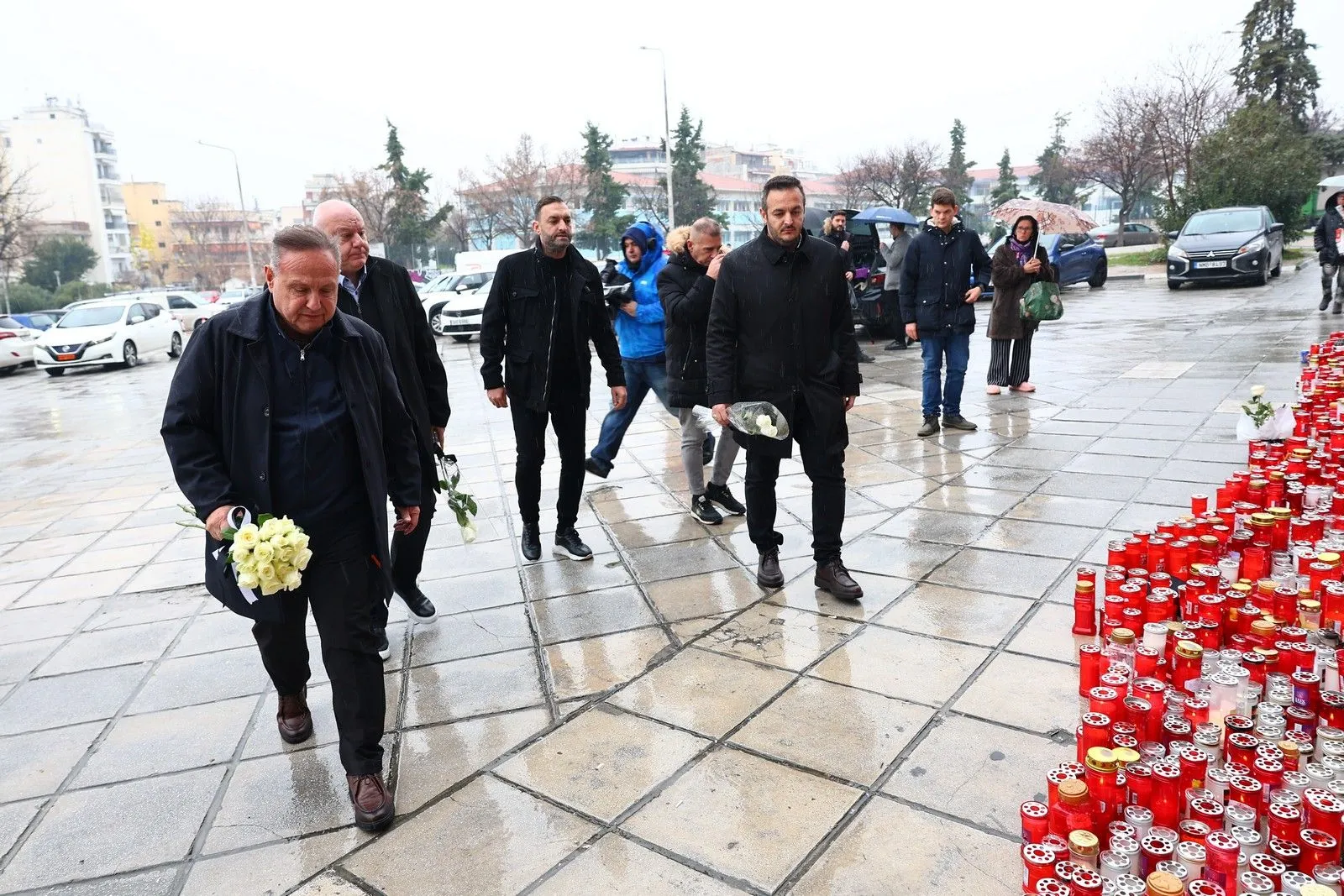 Ο κ. Αγγελούδης, συνοδευόμενος από τον αντιδήμαρχο Ψηφιακής Πολιτικής, Διοικητικής Αναδιάρθρωσης και Εξυπηρέτησης του Πολίτη και πρόεδρο της επιτροπής για τα 100 χρόνια του ΠΑΟΚ, Κώστα Βασιλόπουλο, τον αντιδήμαρχο Μέριμνας για την Τρίτη Ηλικία, Κοινοτήτων και Δημοτικών Αποκέντρωσης, Παντελή Καζαντζίδη, τον δημοτικό σύμβουλο και πρώην άσο του Δικεφάλου, Γιώργο Τουρσουνίδη, τον δημοτικό σύμβουλο και πρώην ποδοσφαιριστή του Άρη, Σάκη Πρίττα και τον πρώην μπασκετμπολίστα που τίμησε τα ασπρόμαυρα χρώματα και μέλος της δημοτικής του παράταξης, Γιάννη Γιαννούλη, άφησε τα λουλούδια σε ένδειξη πένθους και σεβασμού προς τους επτά νεκρούς και τους τρεις τραυματίες.