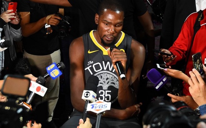 LOS ANGELES, CA - SEPTEMBER 15: Kevin Durant #35 of the Golden State Warriors speaks to the media during the Nike Innovation Summit in Los Angeles, California on September 15, 2017. NOTE TO USER: User expressly acknowledges and agrees that, by downloading and or using this photograph, User is consenting to the terms and conditions of the Getty Images License Agreement. Mandatory Copyright Notice: Copyright 2017 NBAE (Photo by Andrew D. Bernstein/NBAE via Getty Images) NBAE/Getty Images
