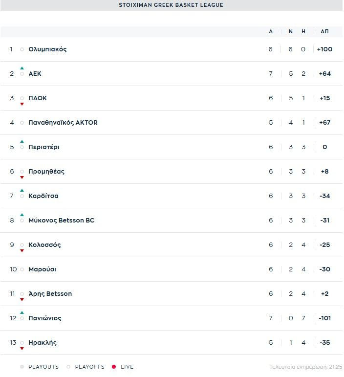 Δείτε πώς διαμορφώνεται η βαθμολογία της Stoiximan GBL στα μέσα της 7ης αγωνιστικής.