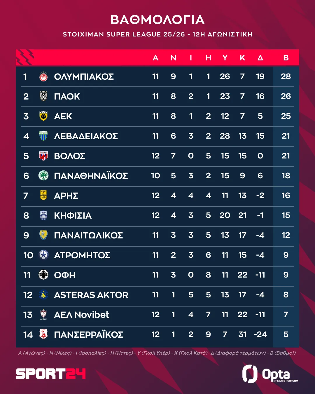 Το πρόγραμμα και τα αποτελέσματα της 12ης αγωνιστικής