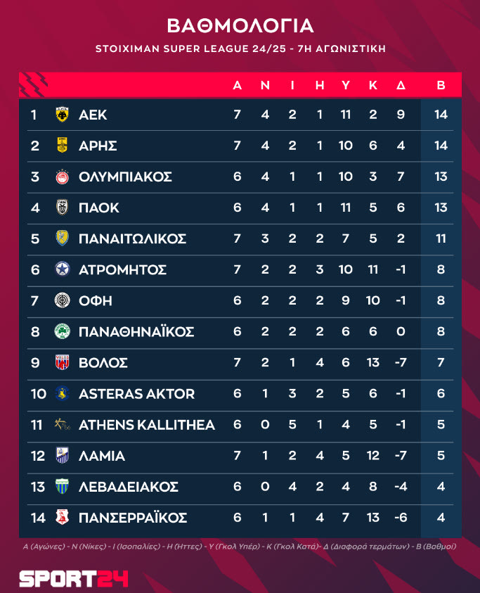 Νωρίτερα, η ΑΕΚ στραβοπάτησε στο Αγρίνιο, καθώς υπέστη την πρώτη φετινή ήττα με 1-0, ενώ στο ματς που άνοιξε το πρόγραμμα της 7ης αγωνιστικής, ο Βόλος “άλωσε” την έδρα του Ατρομήτου (1-2).