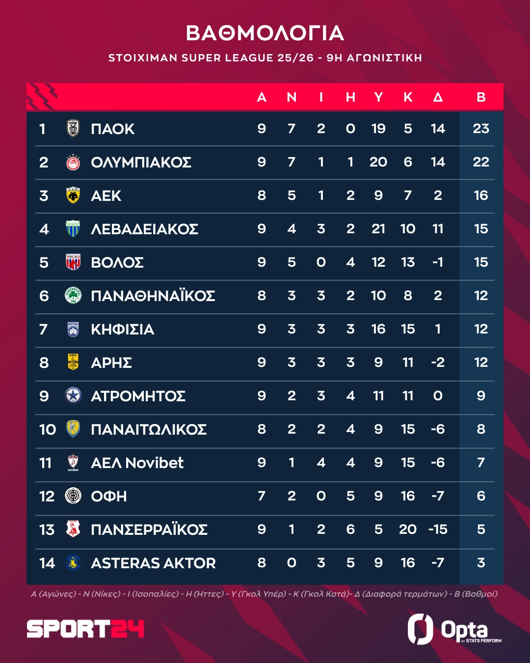 Stoiximan Super League: Η βαθμολογία μετά την πεντάρα του ΠΑΟΚ στις Σέρρες