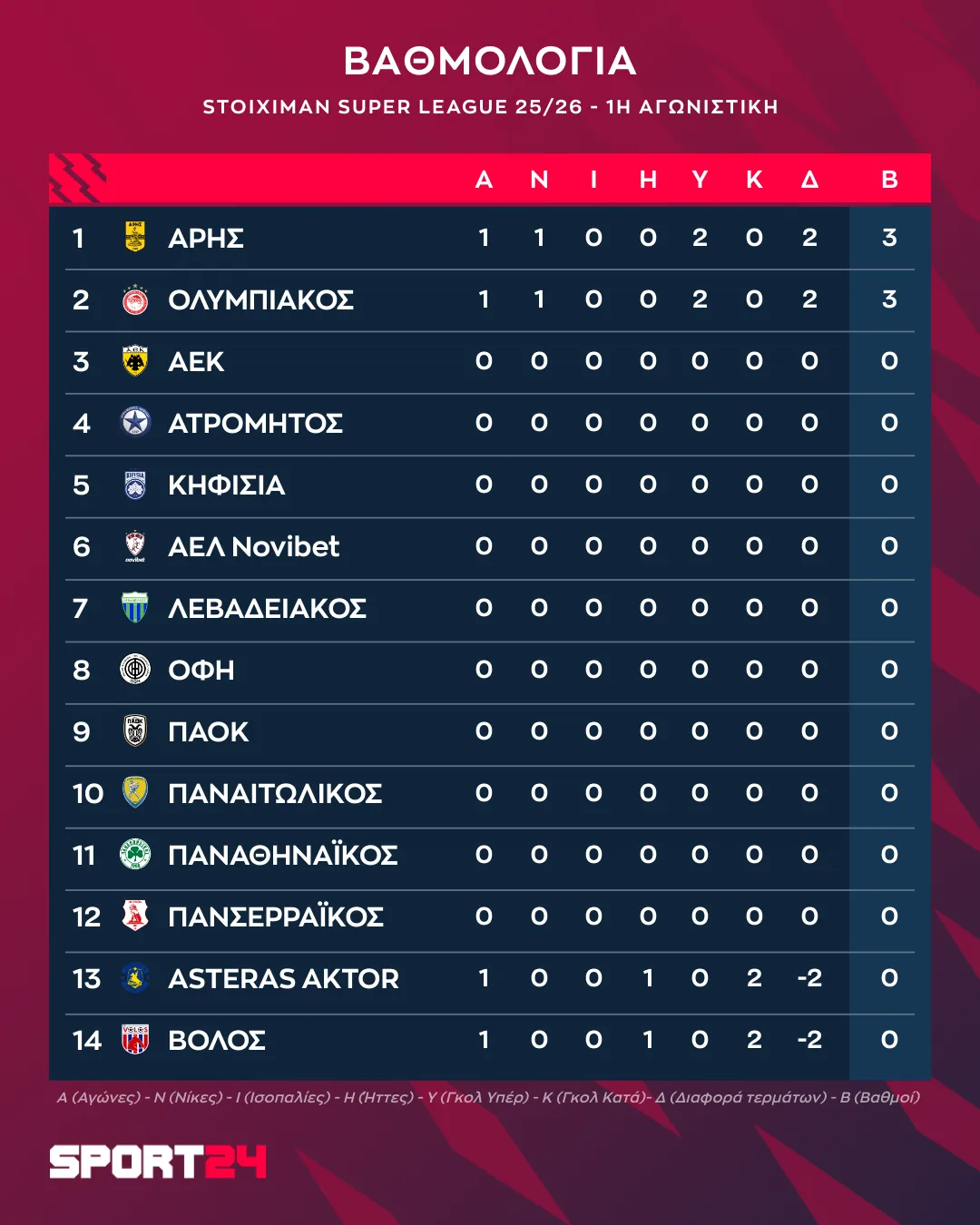Η Stoiximan Super League 2025-26 άνοιξε το Σάββατο (23/8) την αυλαία της, με τον Ολυμπιακό να πανηγυρίζει την πρώτη του νίκη 2-0 κόντρα στον Αστέρα AKTOR με δύο γκολ στις καθυστερήσεις και τον Άρη να ξεκινά με το δεξί στην πρεμιέρα του, επικρατώντας 2-0 του Βόλου.