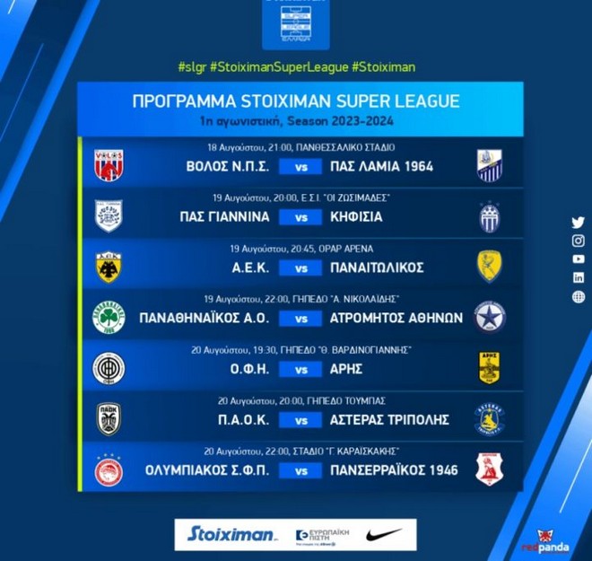 Έγινε γνωστό το πρόγραμμα της 1ης αγωνιστικής του φετινού πρωταθλήματος της Stoiximan Super League με την πρώτη σέντρα να γίνεται την Παρασκευή (18/8) στις 21:00 με το Βόλος – Λαμία. Το Σάββατο 19/8 θα παίξουν ΑΕΚ και Παναθηναϊκός κόντρα σε Παναιτωλικό και Ατρόμητο αντίστοιχα.
