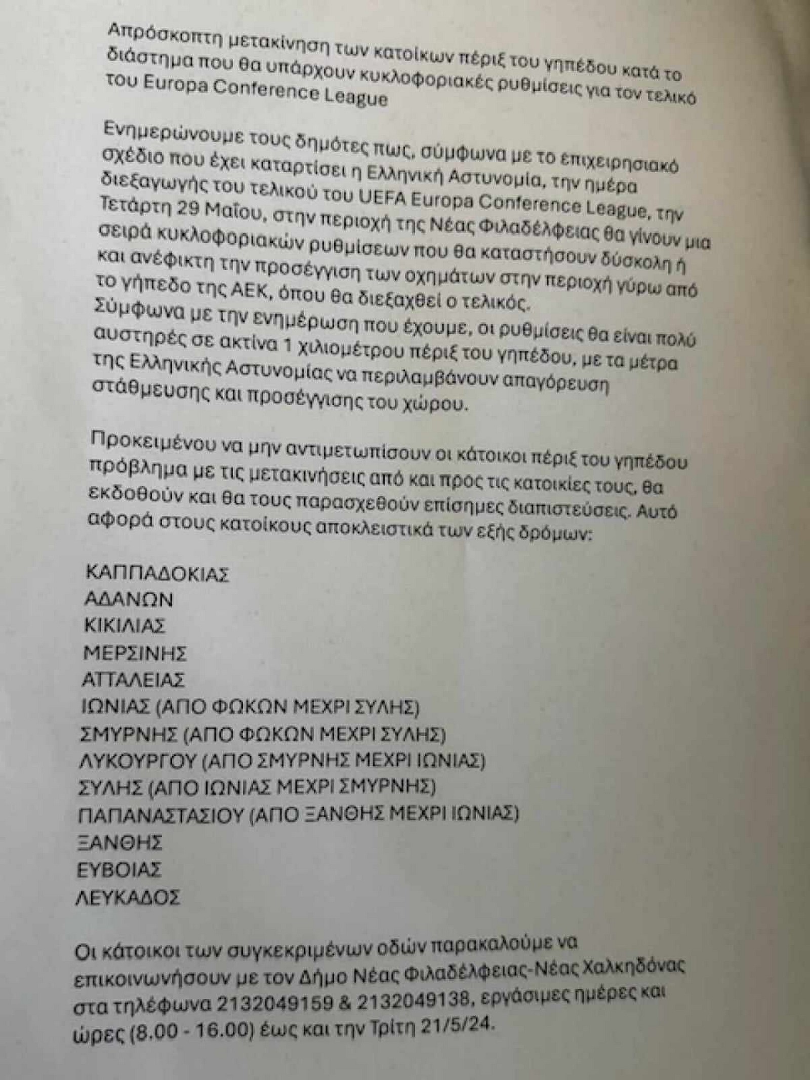 Με διαπίστευση από το τοπικό ΑΤ θα μπορούν οι κάτοικοι των δρόμων πέριξ του γηπέδου της Ν.Φιλαδέλφειας να προσεγγίσουν τα σπίτια τους την ημέρα του τελικού