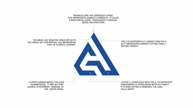 Το σχέδιο στήνεται με επανάληψη του βασικού λογότυπου του Αντετοκούνμπο, ένα G που πλέκεται με ένα A και δίνουν ιεραρχικό προνόμιο στο όνομα της οικογένειας. Απεικονίζεται η μαιανδρική πορεία που είχε το ταξίδι του ήρωα, ενώ η κομμένη γωνία του G αναπαριστά τα ασυνήθιστα αθλητικά ταλέντα του Αντετοκούνμπο. Δεν είναι τυχαίο εξάλλου που το παρατσούκλι του είναι «Greek Freak» λόγω του μοναδικού τρόπου με τον οποίο συνδυάζει ύψος και ευκινησία.