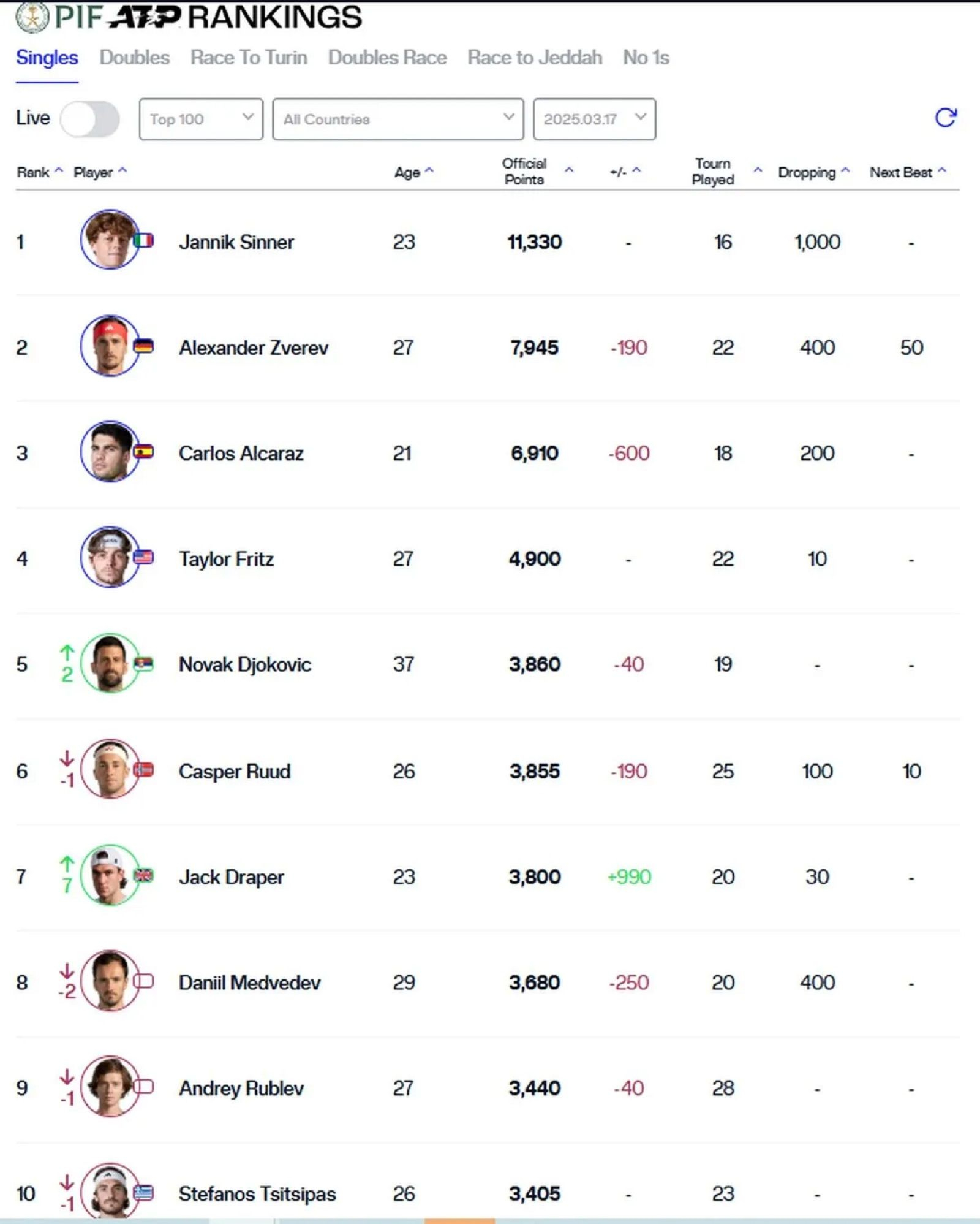 Όπως γράφει το SPORT24, ο Έλληνας τενίστας καταλαμβάνει το Νο10 της ATP Rankings με 3.405 βαθμούς έχοντας λίγο πιο πίσω τους Άλεξ ντε Μινόρ (3,335) και Χόλγκερ Ρούνε (3,270).