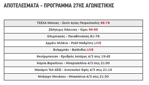 Όπως γράφει το sport24.gr, η βραδιά άνοιξε με την επικράτηση της ΤΣΣΚΑ Μόσχας επί της Ζενίτ Αγίας Πετρούπολης, σε ένα ματς στο οποίο δεν αγωνίστηκε (πριν από τον αγώνα του ΟΑΚΑ) ο τραυματίας Ντάνιελ Χάκετ, ενώ συνεχίστηκε με τη νίκη της Ζάλγκιρις επί της Χίμκι στο Κάουνας. Η ομάδα του Σαρούνας Γιασικεβίτσιους στηρίχθηκε στους Ζακ ΛεΝτέι – Κέι Σι Ρίβερς και συνεχίζει την καταπληκτική της πορεία τους τελευταίους μήνες, καθώς από τις 27 Δεκεμβρίου κι έπειτα έχει ρεκόρ 9-3.