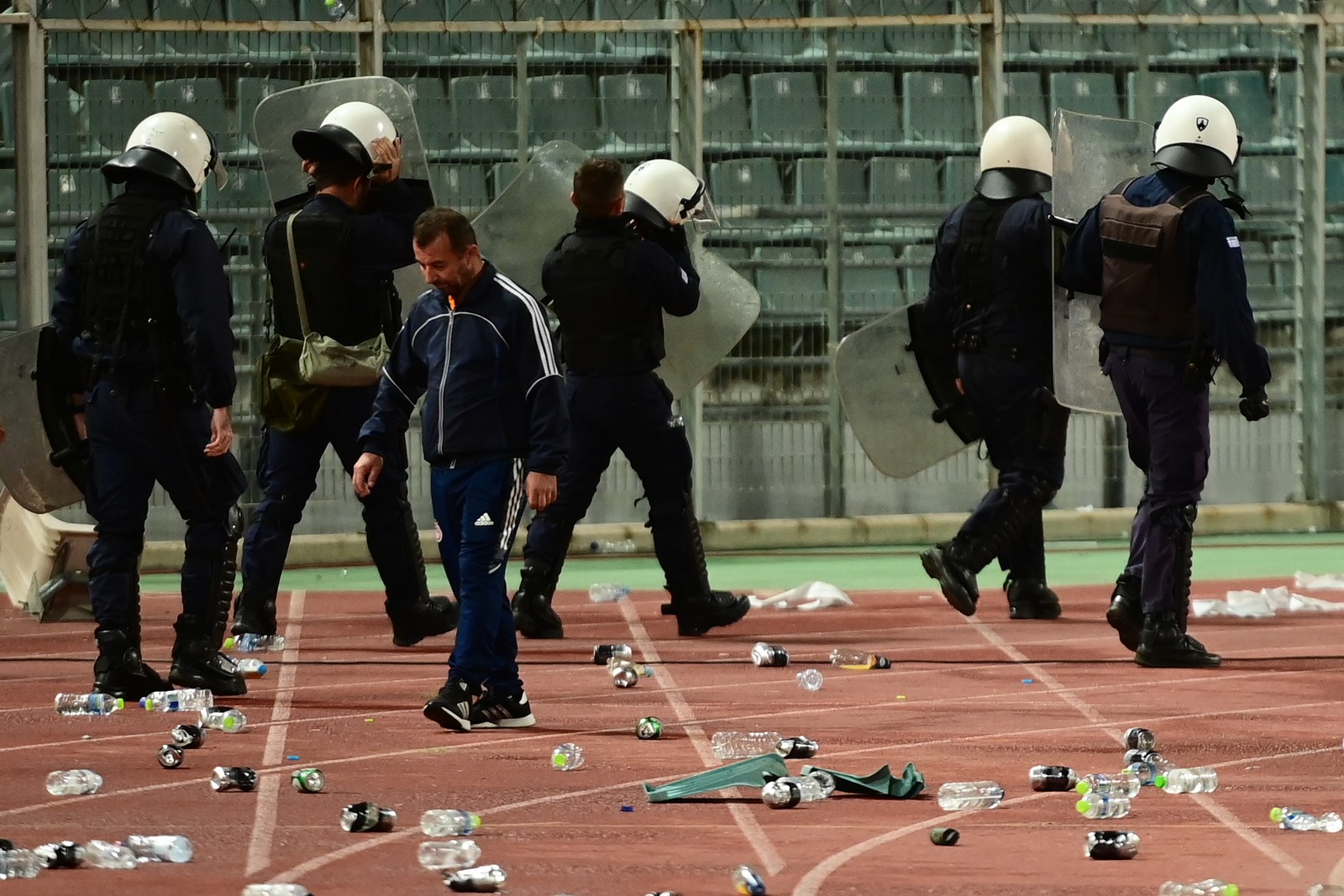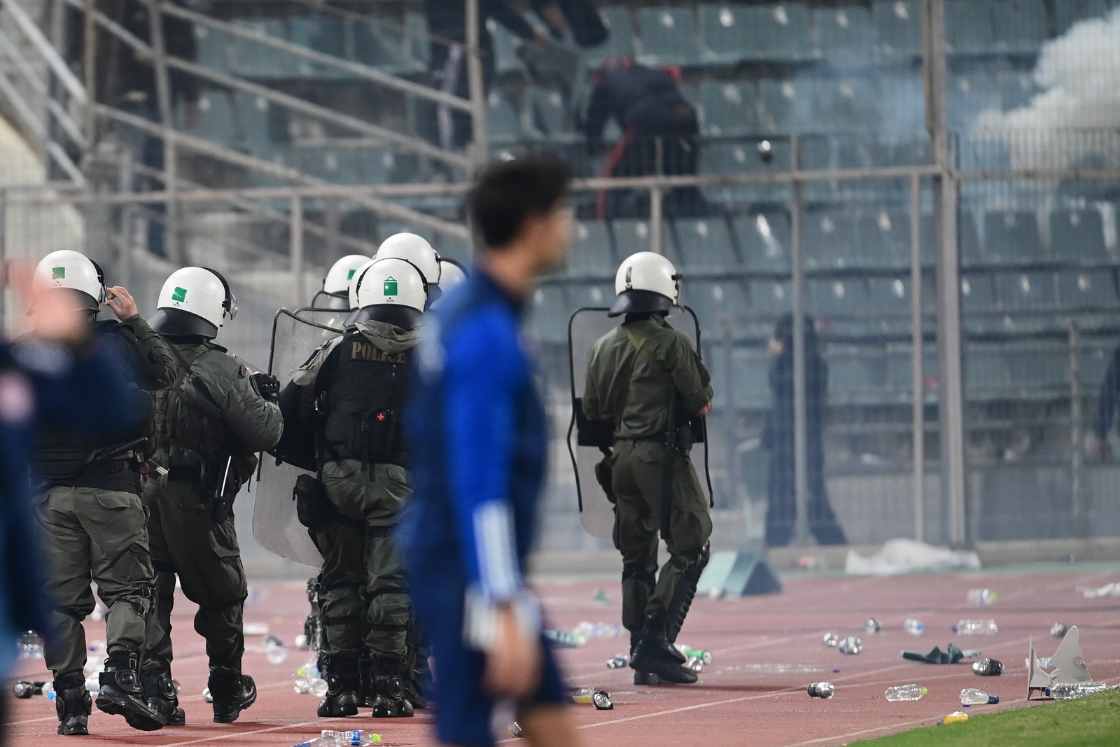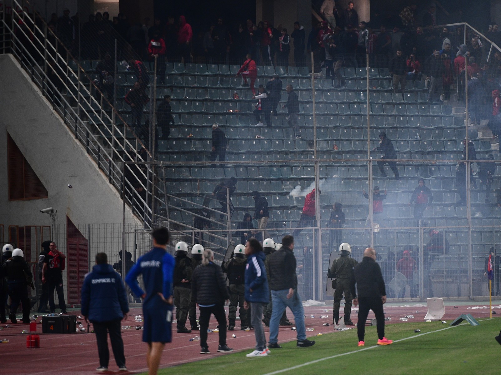 Αρκετοί αστυνομικοί παρατάχθηκαν μπροστά από τους πάγκους, ενώ φίλαθλοι που δεν συμμετείχαν στα επεισόδια αποχώρησαν από τις κερκίδες τους.