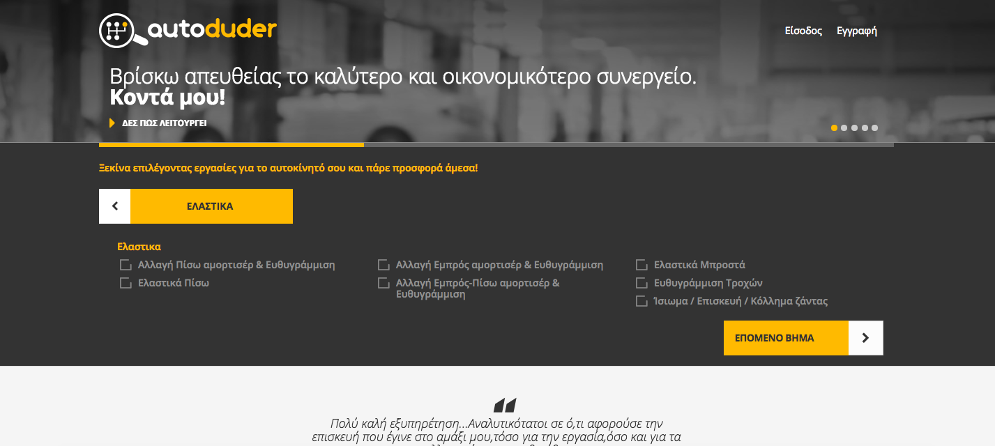Η διαδικασία για τα ελαστικά είναι εύκολη: Ο χρήστης απλά επιλέγει τις διαστάσεις των ελαστικών του και στην οθόνη του παρουσιάζονται αμέσως τα διαθέσιμα ελαστικά με τιμές, αξιολογήσεις και τεχνικά χαρακτηριστικά. Σε περίπτωση που ο χρήστης δεν γνωρίζει το μέγεθος των ελαστικών του, το site μπορεί να τον καθοδηγήσει ώστε να επιλέξει τα κατάλληλα, ενώ σε κάθε βήμα παρέχεται η δυνατότητα της απευθείας βοήθειας μέσω live chat ή τηλεφωνικού κέντρου. Καθώς ο autoduder δεν συνδέεται, ούτε δέχεται διαφήμιση από κατασκευαστές ή εισαγωγείς ελαστικών, οι συμβουλές του είναι εξ-ορισμού οι πλέον αντικειμενικές στην αγορά και με αποκλειστικό γνώμονα το όφελος του πελάτη. Στη συνέχεια ο χρήστης βρίσκει το συνεργείο που επιθυμεί μέσα από πραγματικές αξιολογήσεις και κλείνει το ραντεβού του online, αξιόπιστα και έγκυρα.
