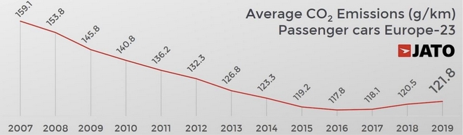 Το 2019, για 3η συνεχόμενη χρονιά και εκεί που είχαμε φθίνουσα πορεία στις μέσες εκπομπές ρύπων, υπήρξε αύξηση στα CO2, φθάνοντας στα επίπεδα του 2014. Δηλαδή γυρίσαμε 5 χρόνια πίσω. Όμως, μπορούμε να πάμε σύντομα πολλά χρόνια μπροστά. Σύμφωνα με τα στοιχεία της JATO Dynamics, ο μέσος όρος για τις 23 ευρωπαϊκές αγορές ανήλθε σε 121,8 γρ./χλμ. κι αυτό επειδή μειώθηκαν οι πωλήσεις πετρελαιοκίνητων αυτοκινήτων και αυξήθηκαν οι εκδόσεις βενζίνης. Αυτό έχει την εξήγηση, ότι τα νέα μοτέρ βενζίνης, από πολύ μικρό κυβισμό, από τα 1000 κ.εκ., βγάζουμε μεγάλη ιπποδύναμη και υψηλή ροπή, εφάμιλλη εκδόσεων πετρελαίου μεγαλύτερου κυβισμού.
