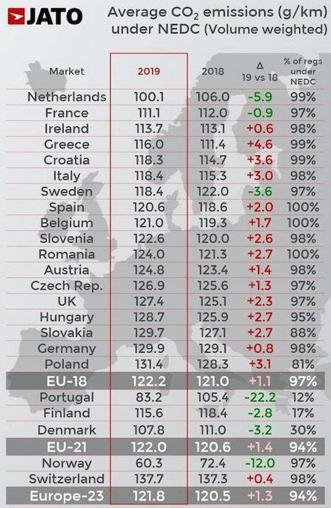 Επιπλέον, τέσσερις από τις πέντε μεγαλύτερες αγορές στην Ευρώπη παρουσίασαν υψηλότερους μέσους όρους το 2019, σε σχέση με το 2018. Οι μέσες εκπομπές για τη Γερμανία, τη Βρετανία, την Ιταλία και την Ισπανία αυξήθηκαν από 0,8 γρ./χλμ. στη Γερμανία, έως 3,0 γρ./χλμ. στην Ιταλία. Η Γαλλία, ήταν η μόνη αγορά που είδε καλύτερα αποτελέσματα, καθώς ο μέσος όρος μειώθηκε από 112,0 γρ./χλμ. το 2018 σε 111,1 γρ./χλμ., πέρυσι.