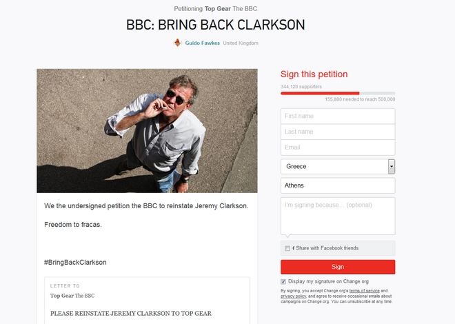 Περισσότερες από 340.000 φανατικοί τηλεθεατές του Top Gear ζητούν την άμεση επιστροφή του διάσημου παρουσιαστή Jeremy Clarkson, που τέθηκε σε διαθεσιμότητα από το BBC, μετά από επεισόδιο στο οποίο ενεπλάκη με παραγωγό του βρετανικού καναλιού.