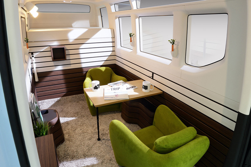Το εμπρός μέρος του τροχόσπιτου διαθέτει ένα κρεβάτι με μήκος μόλις 1,80 μ. που μπορεί να κοιμίσει δύο άτομα. Αυτονόητο είναι πως αν το ύψος του ενός ατόμου είναι μεγαλύτερο του 1,8 μ. θα υπάρχει πρόβλημα. Επίσης υπάρχει μια μικρή κουζίνα και ένα μικρό σαλονάκι επίσης για δύο άτομα.