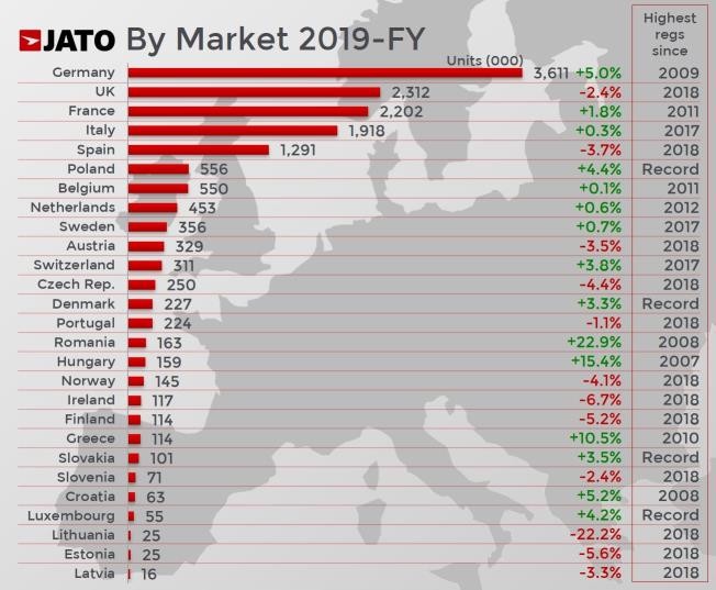 Τέσσερις χώρες εμφάνισαν αριθμούς ρεκόρ σε ταξινομήσεις το 2019: Πολωνία, Δανία, Σλοβακία και Λουξεμβούργο. Η Ουγγαρία παρουσίασε επίσης τα καλύτερα αποτελέσματα από το 2007. Η Ρουμανία και η Ουγγαρία είχαν τη μεγαλύτερη ποσοστιαία αύξηση, ενώ η Γερμανία έδειξε τα υψηλότερα επίπεδα ταξινομήσεων από το 2009. Η Ελλάδα, όπως έχουμε γράψει, με +10,5% ήταν η τρίτη χώρα με τη μεγαλύτερη αύξηση πωλήσεων. Ωστόσο, 12 χώρες παρουσίασαν μείωση πωλήσεων σε σύγκριση με το 2018, συμπεριλαμβανομένου του Ηνωμένου Βασιλείου και της Ισπανίας.