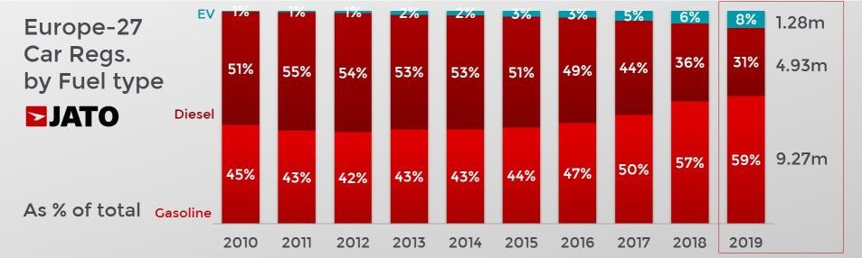 Τα ηλεκτροκίνητα οχήματα αποτελούσαν το 8,1% των συνολικών πωλήσεων, ορίζοντας ένα νέο παγκόσμιο ρεκόρ για αυτή τη κατηγορία, που έχει το μέλλον μπροστά της. Ο όγκος ανήλθε σε 1.277.908 μονάδες, αυξημένος κατά 35% σε σύγκριση με το 2018. Αυτή η ανάπτυξη έρχεται σε αντίθεση με τη μείωση κατά 12% που σημειώθηκε από τις πωλήσεις πετρελαιοκίνητων οχημάτων και τη δεινή αύξηση της τάξης του 5% που σημειώθηκε στα βενζινοκίνητα αυτοκίνητα.