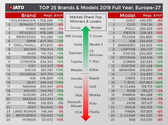 Η αναταραχή που έπληξε την παγκόσμια αυτοκινητοβιομηχανία το 2019 δεν ήταν αρκετά δυνατή για να ζημιώσει τη ζήτηση για νέα αυτοκίνητα στην Ευρώπη. Στην πραγματικότητα, ο όγκος των πωλήσεων οχημάτων αυξήθηκε κατά 1,1% για την αγορά επιβατικών αυτοκινήτων στην Ευρώπη των 27 χωρών, γεγονός που έρχεται σε αντίθεση με τα αρνητικά αποτελέσματα που σημειώθηκαν στην Κίνα και στις ΗΠΑ, όπου οι πωλήσεις μειώθηκαν κατά 8% και 2%, αντίστοιχα. Επιπλέον, το 2019 ήταν η πέμπτη συνεχής χρονιά ανάπτυξης για την Ευρώπη και το υψηλότερο αποτέλεσμα από το 2007, όταν η αγορά υπερέβη το όριο των 16 εκατομμυρίων μονάδων. Συνολικά, 15.757.412 νέα αυτοκίνητα ταξινομήθηκαν πέρυσι, ήτοι 171.452 παραπάνω από το 2018. Κι όλα αυτά, σύμφωνα με την έρευνα της Jato.
