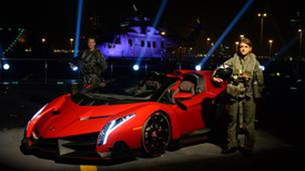 Στο κατάστρωμα της μήκους 240 μέτρων ναυαρχίδας του ιταλικού στόλου, του αεροπλανοφόρου Cavour που βρίσκεται αγκυροβολημένο στο λιμάνι της Mina Zayed στο Αμπού Ντάμπι, πραγματοποίησε η Lamborghini το ντεμπούτο της τελευταίας και ίσως πιο τρελής δημιουργίας της, της Veneno Roadster.
