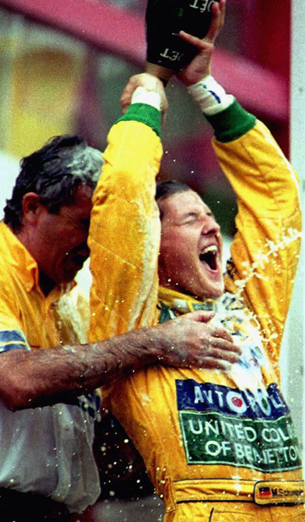 1992 Βελγικό GP : Ο Σούμι πανηγυρίζει έξαλλα την πρώτη -από τις 91- νίκη του στο παγκόσμιο πρωτάθλημα της Φόρμουλα 1. Ο Γερμανός θριάμβευσε με το μονοθέσιο της Benetton στην βρεγμένη πίστα του Σπα.